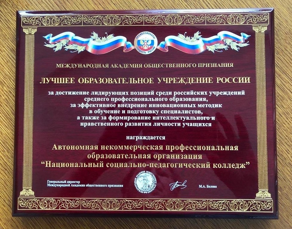 Представители Международной академии общественного признания объявили Национальный социально-педагогический колледж лучшим образовательным учреждением среди средних профессиональных образовательных организаций (колледжей).
